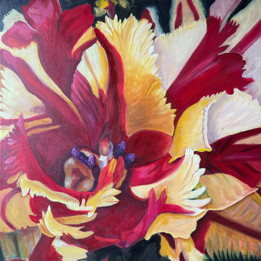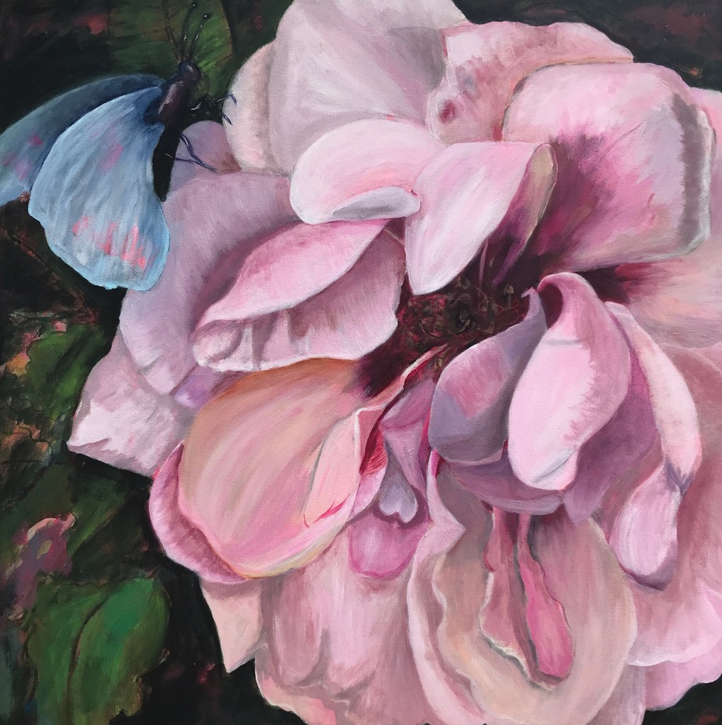 This 30″ x 30″ painting came about during the pandemic. Just as the butterfly emerges from a cocoon and a rose emerges from a bud. I felt my own artistic talent emerging forth with more creativitiy and freedom as I developed this piece.