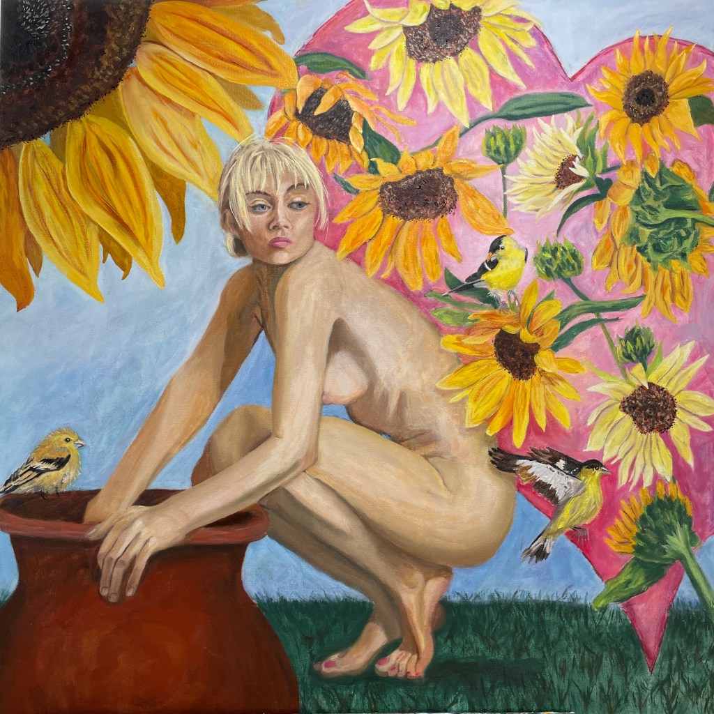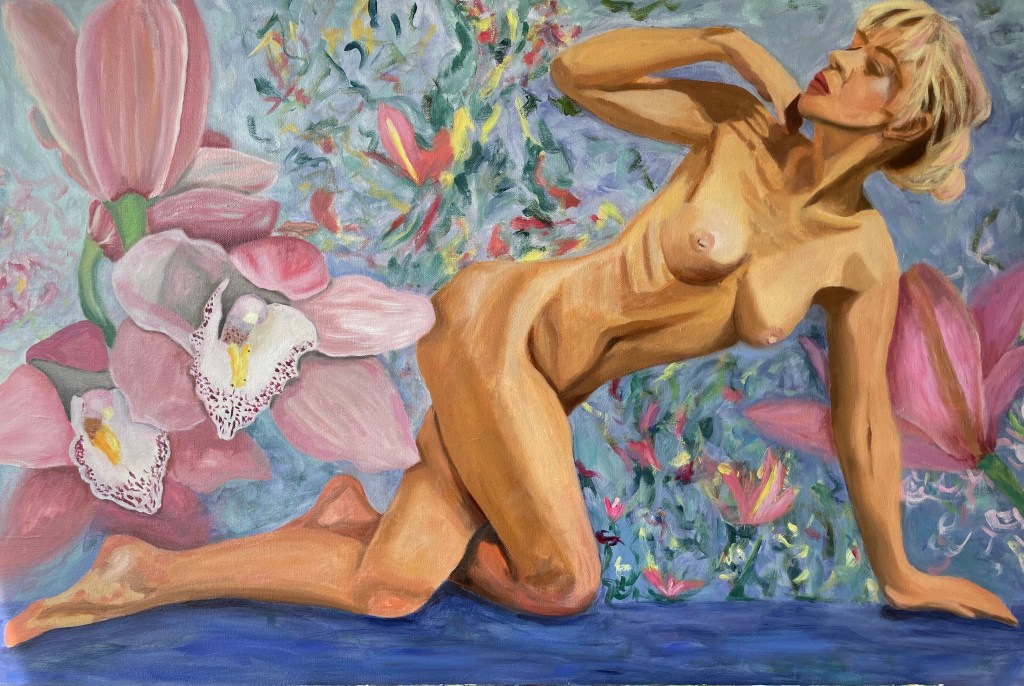 This dreamy painting was the first in the series to incorporate a nude among the florals. At 24″ x 36″ it makes a statement.