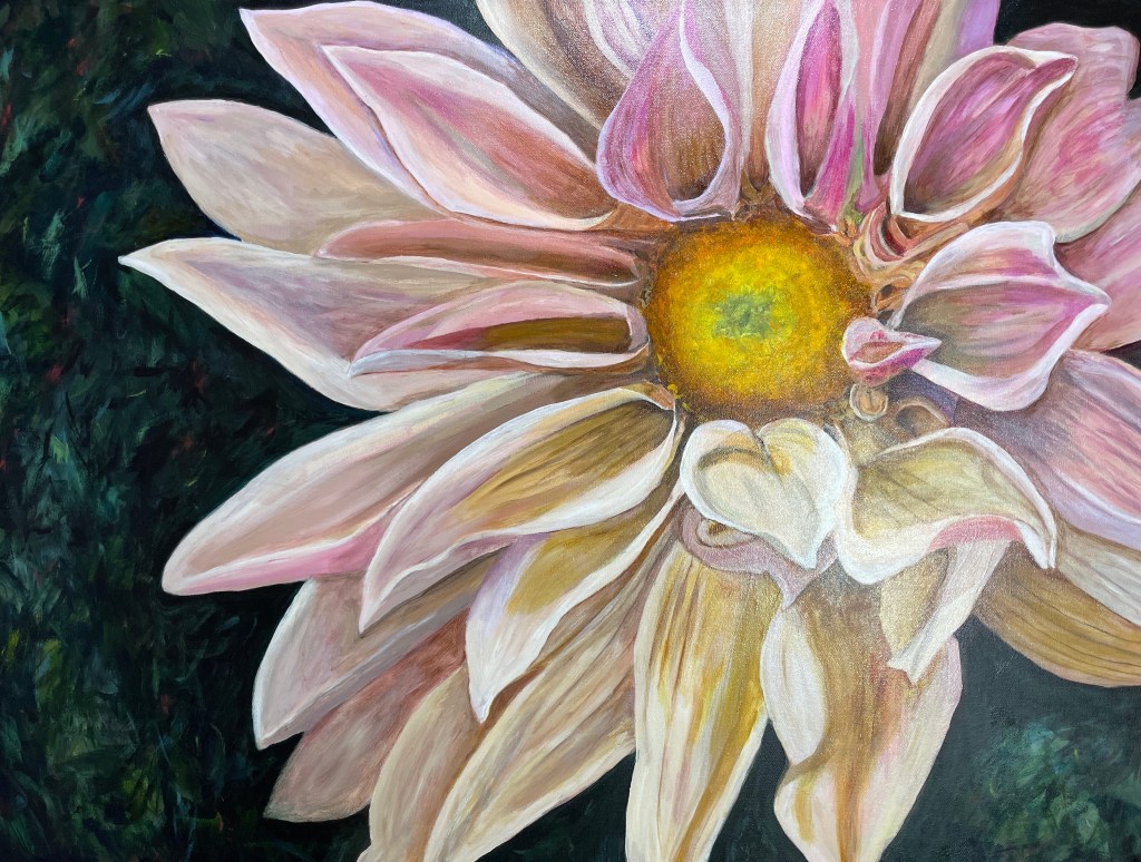 This 30″ x 40″ painting has a dark abstracted background and a solo bloom.